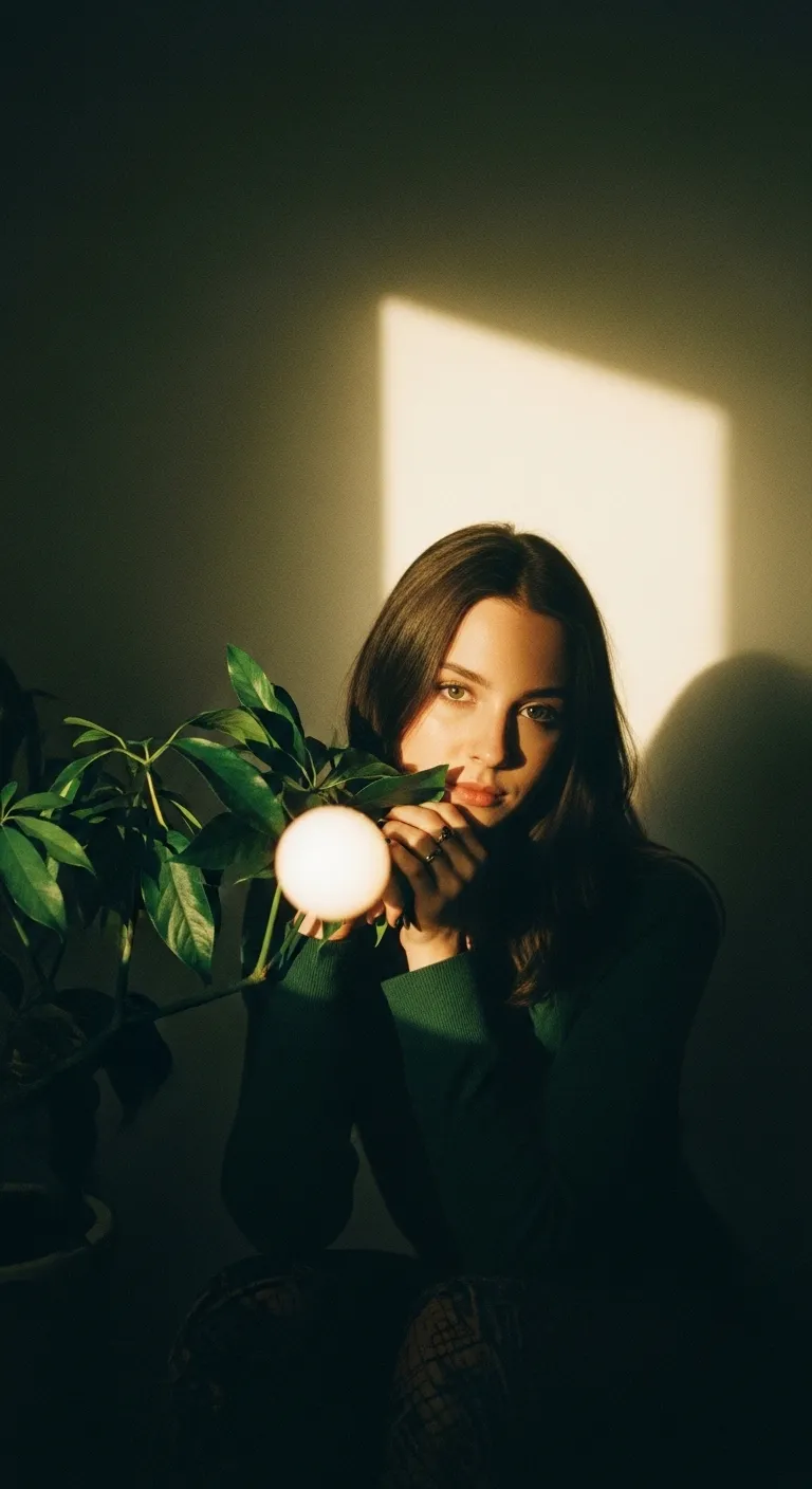 A woman holding a glowing round light bulb next to a houseplant.