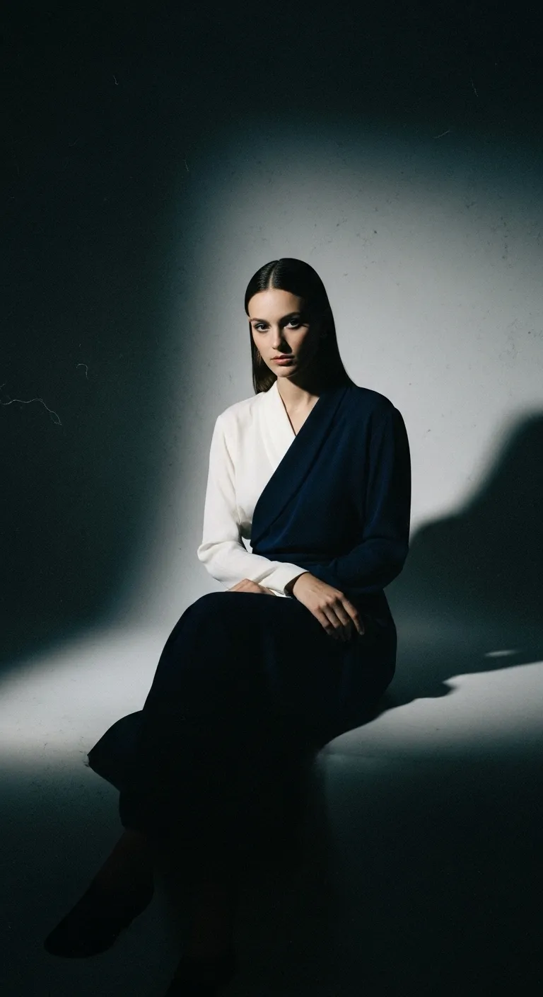 A woman in a blue and white wrap dress sitting in a spotlight against a dark wall.