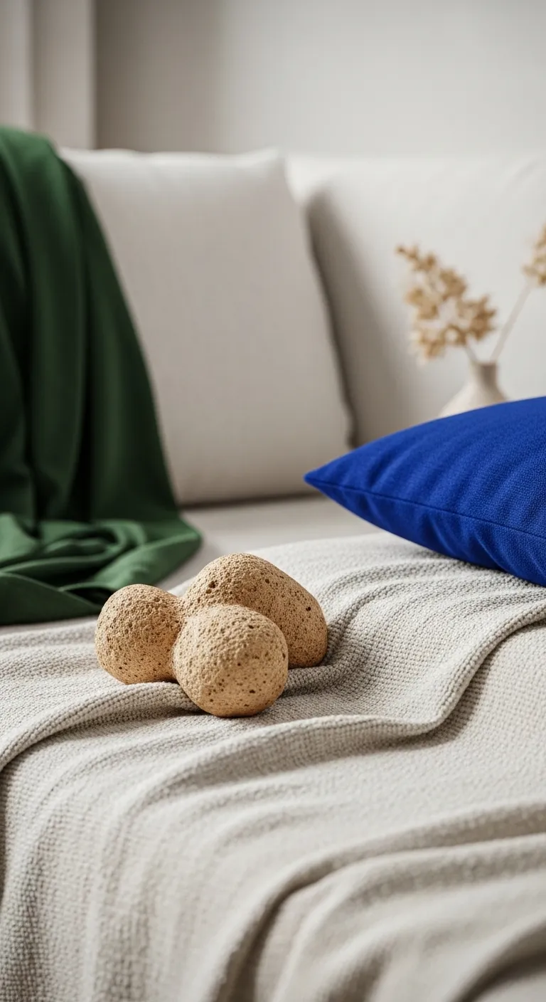 Close-up of decorative round stones resting on a neutral knit blanket.