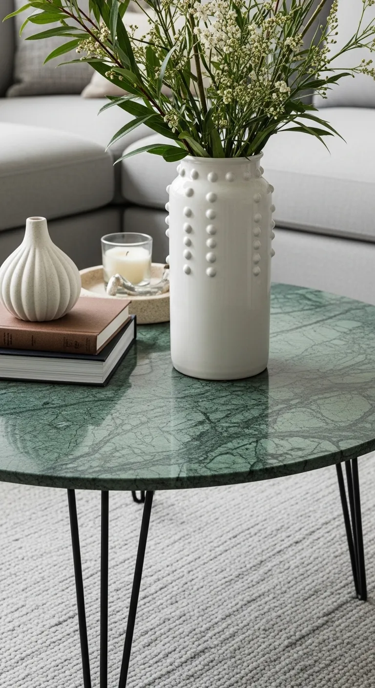 A luxury green marble coffee table decorated with books and a textured vase.