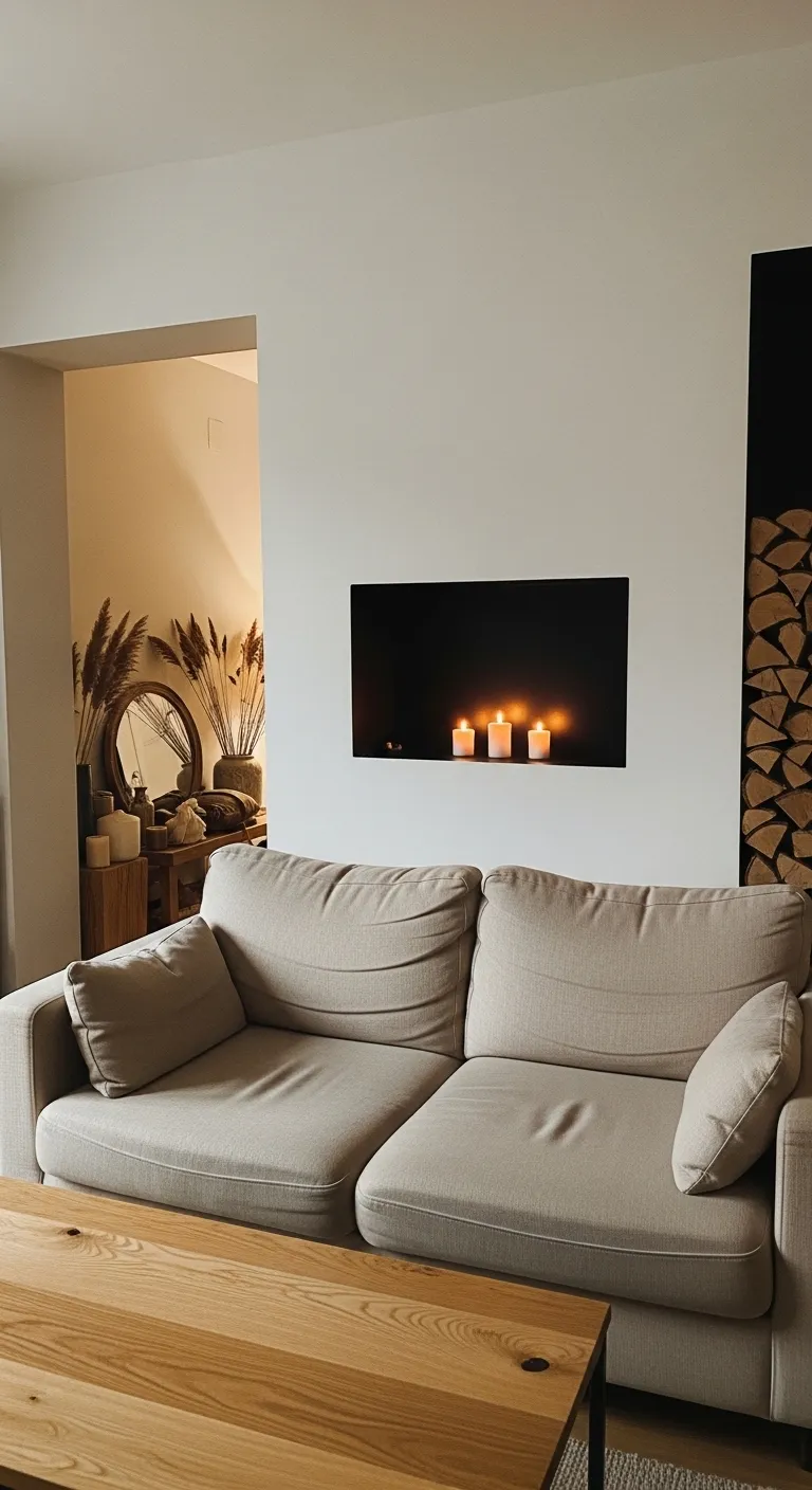 A modern living room with a beige sofa and a sleek built-in fireplace.