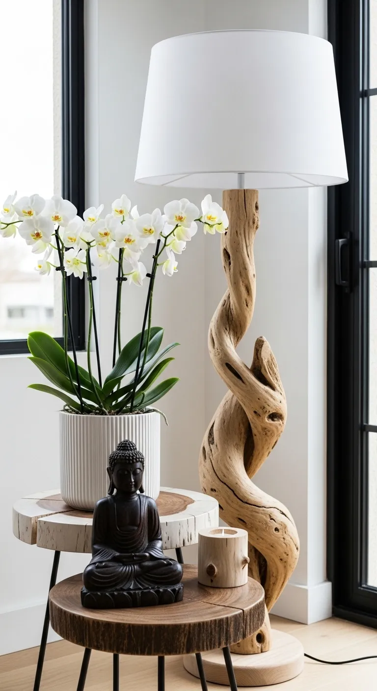 A unique lamp with a twisted wood base next to white orchids in a pot.
