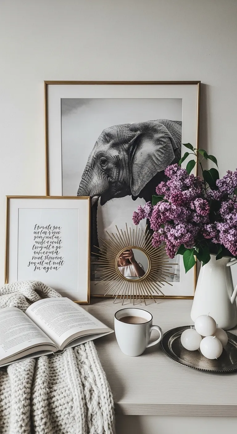 A desk with an elephant print lilac flowers and a cup of coffee.