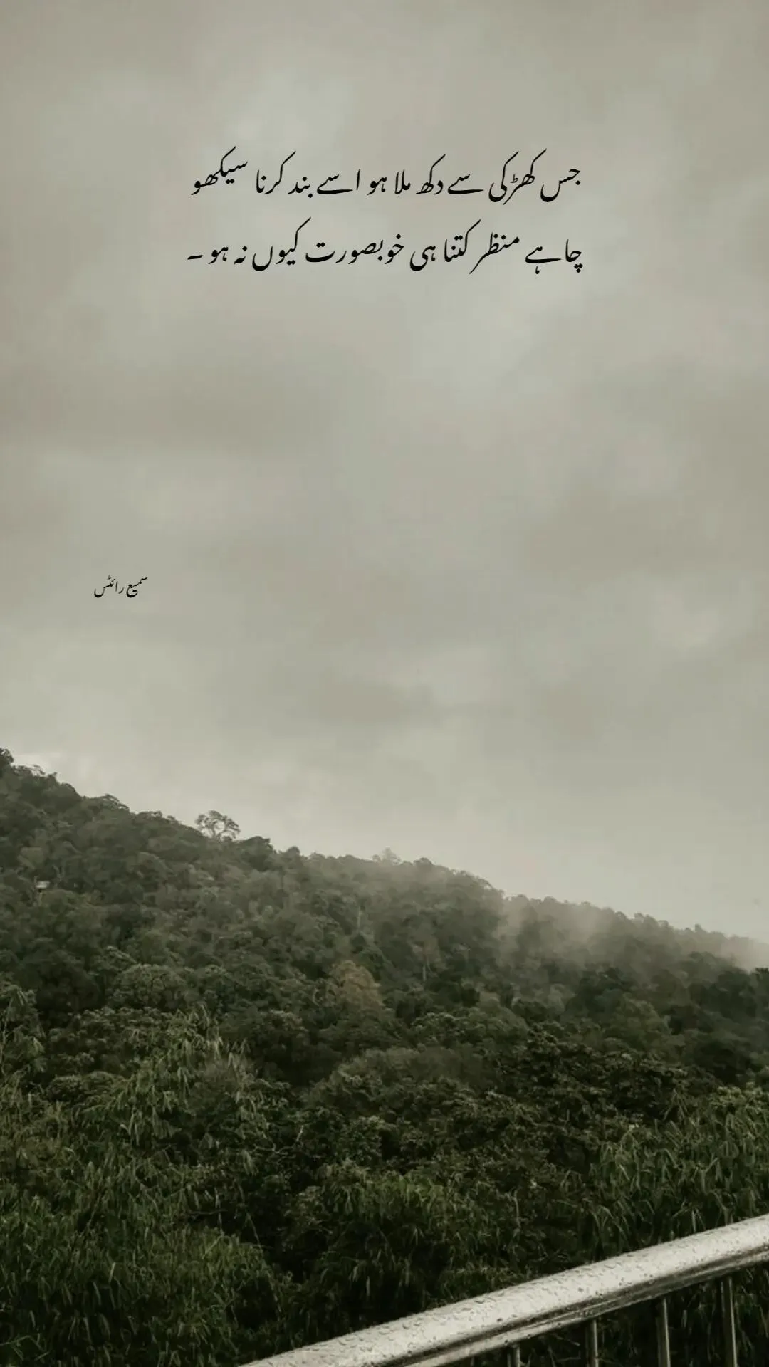 A beautiful misty green mountain landscape seen from a balcony