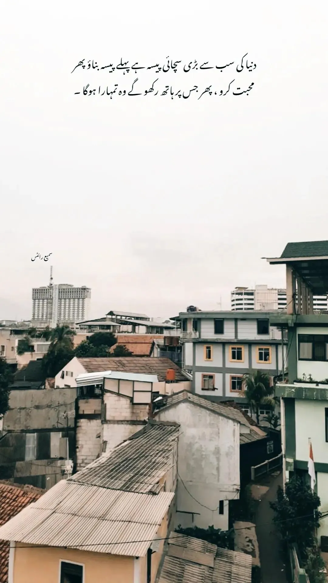 A cluttered urban rooftop view