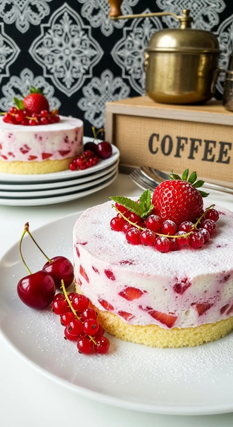 Two small round sponge cakes topped with a thick layer of pink berry mousse and fresh fruit.